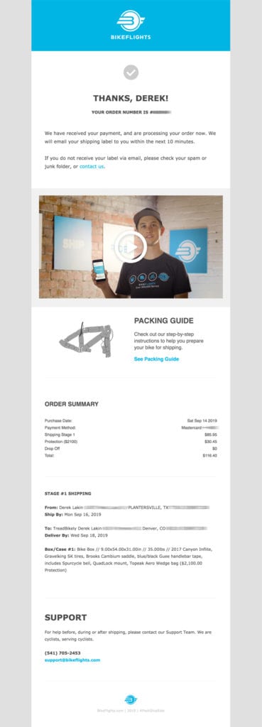 After your order’s placed, BikeFlights’ website automatically sends you a confirmation email, along with another email with your shipping label attached. You’ll then receive notifications once your bike’s shipped and delivered, which largely makes it a hands-off process after your bike’s boxed and dropped off at UPS.