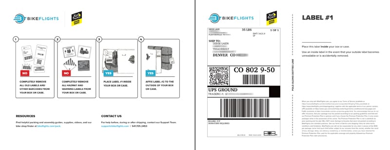 After paying, you’ll receive your shipping labels by email within 30 minutes. You’ll also find your labels in your BikeFlights account, as long as you’re within 30 days of shipping.