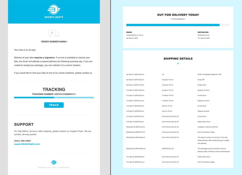 You can then utilize your UPS tracking number to keep tabs on your shipment until it arrives safe and sound. If for some reason you miss delivery of your package, BikeFlights recommends reaching out to them directly for help.
