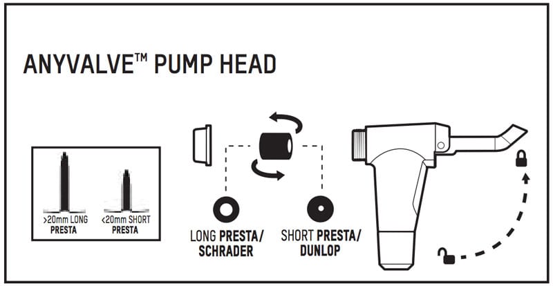 - AnyValve head works with Presta and Schrader, without requiring disassembly/reassembly
