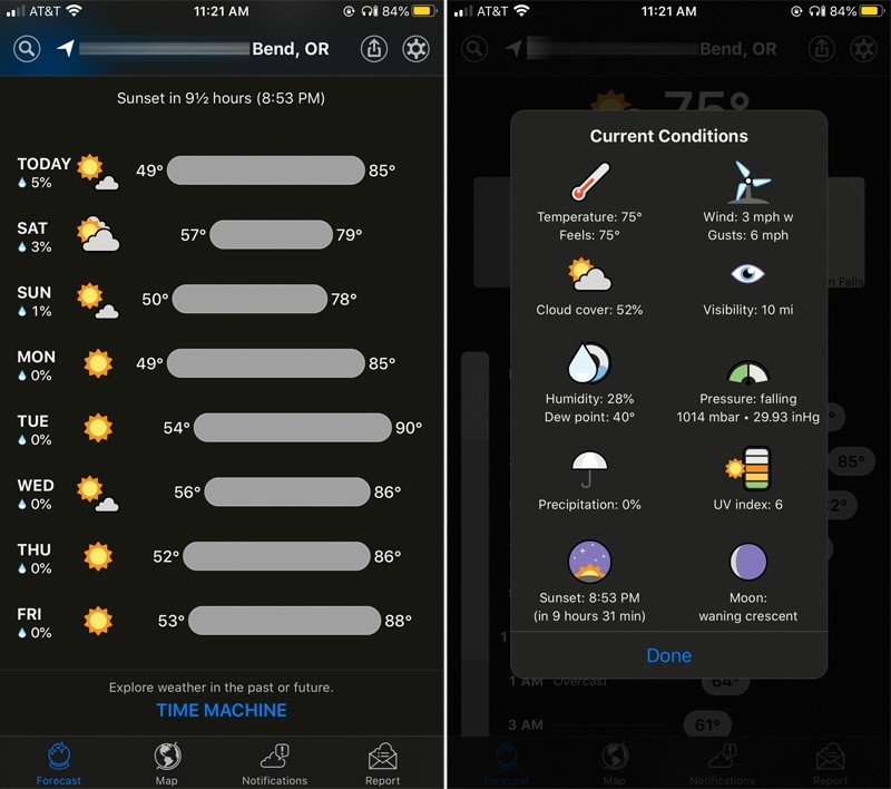 I’ve found that the Dark Sky app is super customizable based on the data that matters most to me, including the daily summaries I receive each morning at 7:30 am, which provides a quick overview of sunset and sunrise times, temperatures, and wind data.