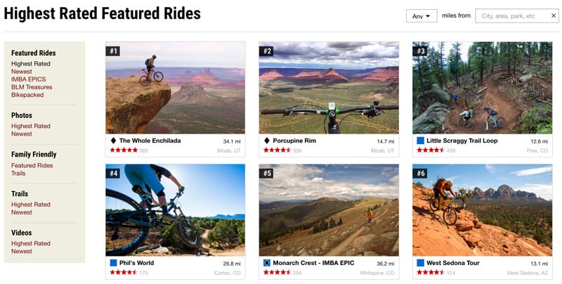 All trail segments and routes featured in MTB Project’s database are user-generated. The organization offers several ways to locate trails, whether listed by state, viewed via maps, searched by city or trail name, or browsed via classifications like top rides or best photos, as voted by users.