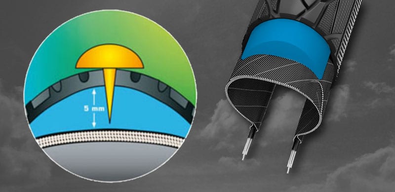 This technology involves 5 mm of flexible rubber, part of which is natural, while the remainder is derived from recycled polymers. It’s thickest in the center for maximum top puncture protection and gradually thins toward each sidewall.